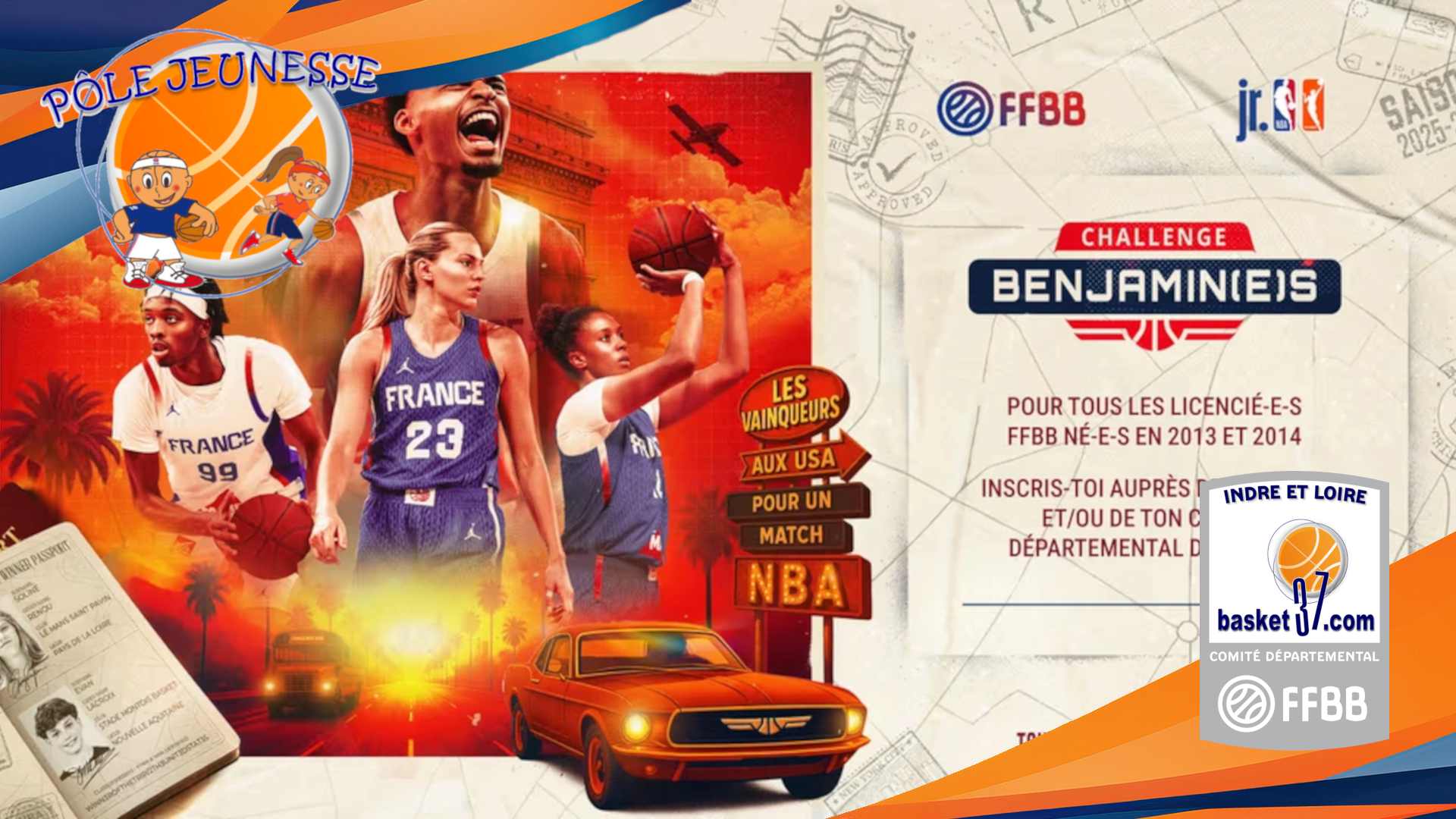 Finale Départementale le 1er février 2026 au C.S.U. Grandmont de 9h30 à 12h30. Si tu es né(e) en 2013 ou en 2014 et licencié(e) FFBB, inscris-toi au Challenge Benjamin(e)s ! Basé sur des épreuves individuelles, ce Challenge t’emmènera directement à Paris ! A gagner : un voyage aux Etats-Unis pour vivre une expérience NBA !