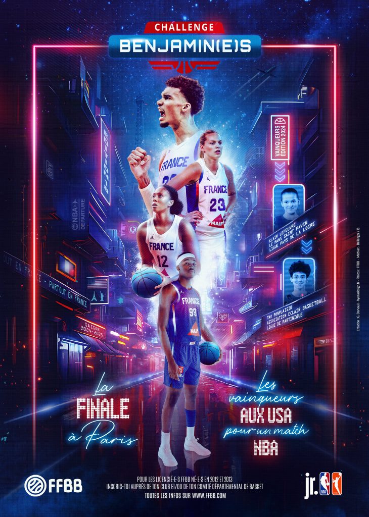 Si tu es né(e) en 2012 ou en 2013 et licencié(e) FFBB, inscris-toi au Challenge Benjamin(e)s ! Basé sur des épreuves individuelles, ce Challenge t’emmènera à Paris pour la finale ! A gagner : un voyage aux Etats-Unis pour vivre une expérience NBA !